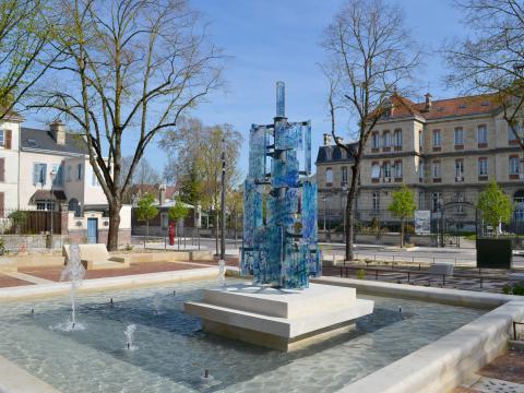 Une grande sculpture verrière est installée Place de la Tour, dans une fontaine à bassin carré. Cette pièce de 500 kg de verre, à la structure d’acier portant 20 panneaux de verre laissant jouer la lumière et surmontée d’une flèche cristalline, représente un véritable défi. Avec la collaboration de Didier Duchêne, Compagnon du Devoir et dirigeant de la métallerie CMD² à Estissac, Jean-François Lemaire, artiste verrier, a ainsi réalisé ce qui est sans doute, en France, la première sculpture d’art urbain verrier de grande taille. Cette œuvre, qui exprime plusieurs thèmes avec le vocabulaire de l’art contemporain, est une commande de la Ville de Troyes. Les thèmes que l’artiste et la Ville avaient convenu de développer dès le printemps 2018 sont en lien avec l’histoire, l’eau et la couleur bleue. Est aussi à la source du projet un hommage au peintre Claude Monet, qui a si souvent peint les reflets de la lumière sur les fleuves, étangs et rivières.