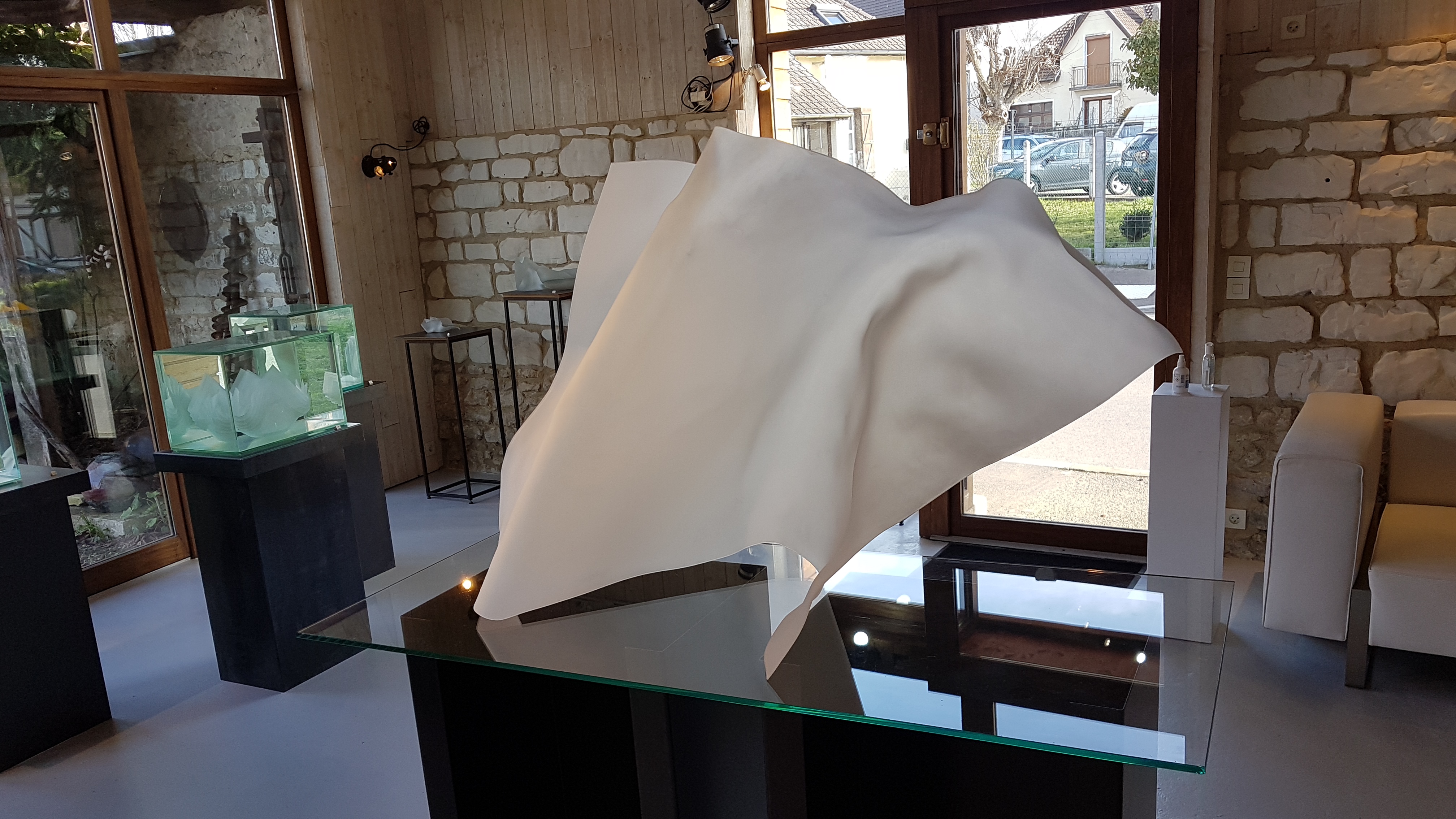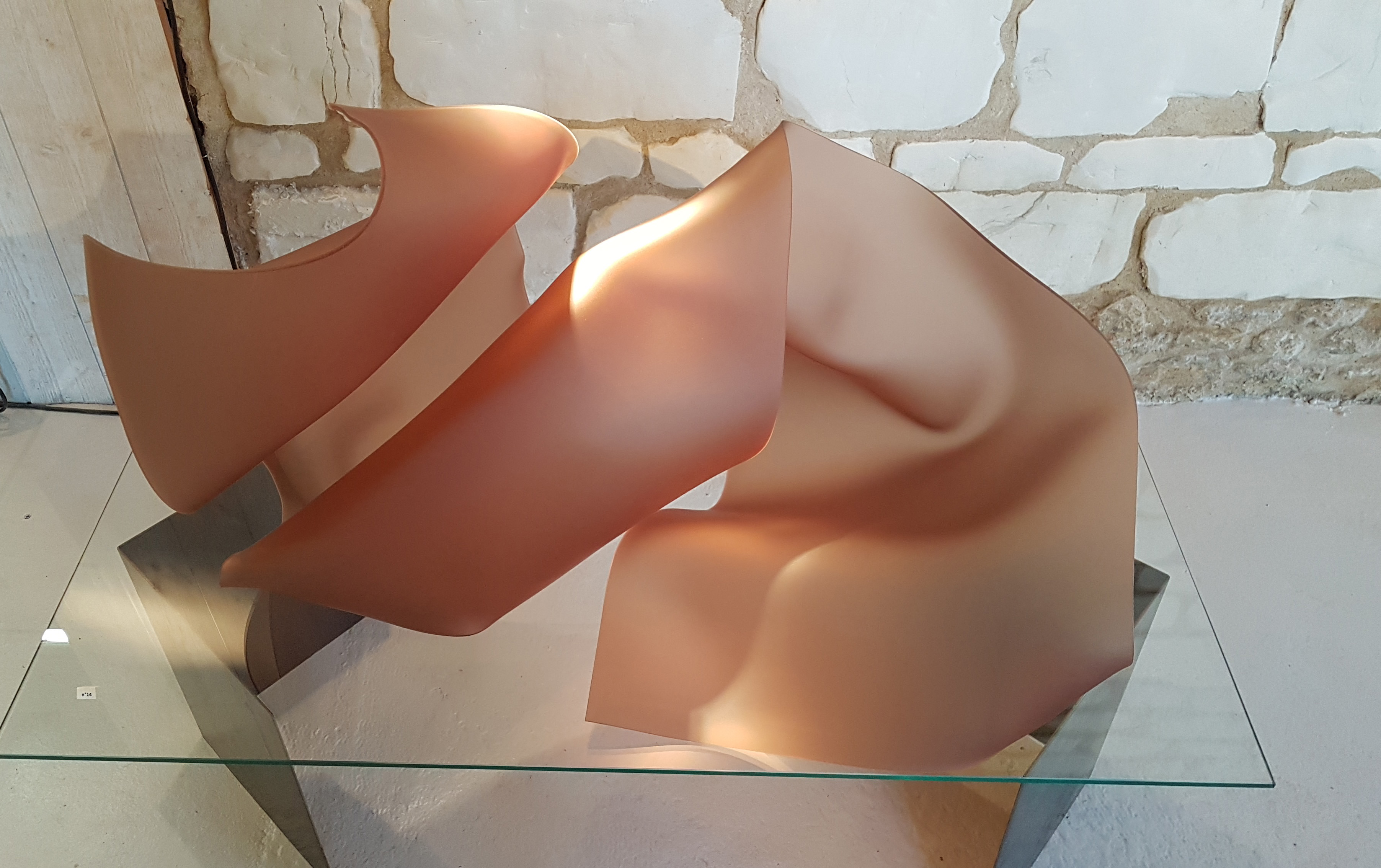 "Dans ma pratique de la sculpture, j’explore les aspects d’une figure récurrente : le pli. Cette forme singulière dont l’historien de l’art Henri Focillon disait qu’elle a « la valeur d’une écriture » est tout à la fois un motif et une allégorie. Bien que je travaille ponctuellement avec des matériaux comme la céramique, le cuivre, l’huile ou l’eau, je me concentre actuellement sur le verre et le plexiglas."